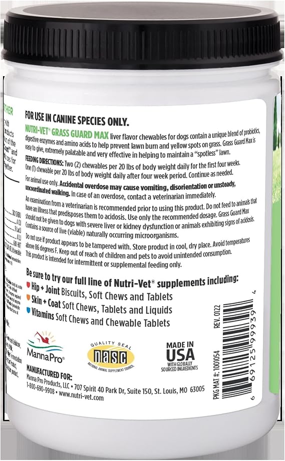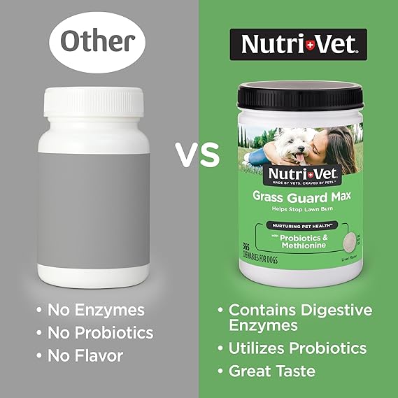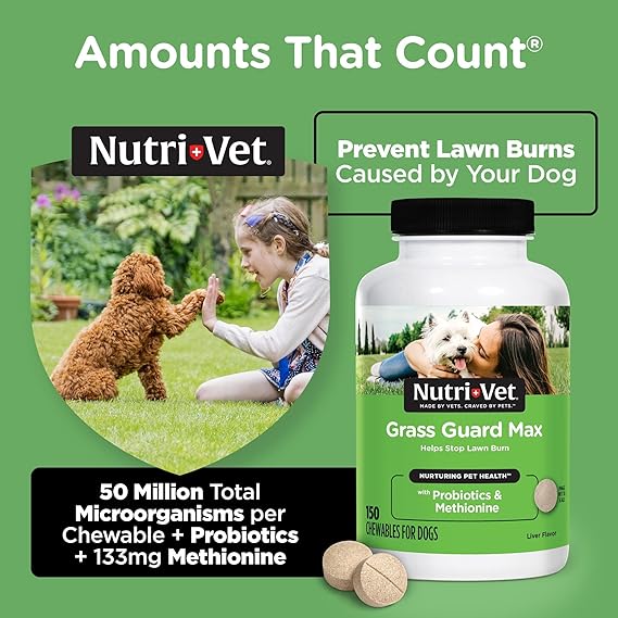 Nutri-Vet Grass Guard Chewables for Dogs are specially formulated to help prevent unsightly yellow spots and grass burn caused by dog urine on lawns and outdoor areas. These tasty liver-flavored tablets contain a unique blend of ingredients including dl-methionine yucca schidigera extract and B-complex vitamins that work together to reduce ammonia levels in your dog’s urine and support overall urinary tract health. Designed for dogs of all sizes and breeds this lawn saver supplement supports healthy digestion and normal pH balance while promoting a healthier lawn and a happier pet owner. The chewable format makes it easy to administer as a daily treat and the formula includes antioxidants and essential nutrients to enhance your dog’s vitality and immune function. Whether used seasonally or year-round Nutri-Vet Grass Guard is a trusted choice for pet parents who want to maintain both a vibrant yard and a thriving canine companion. Veterinarian-formulated and made in the USA this supplement combines quality performance and ease of use in one effective product to minimize lawn damage and promote wellness.
