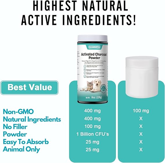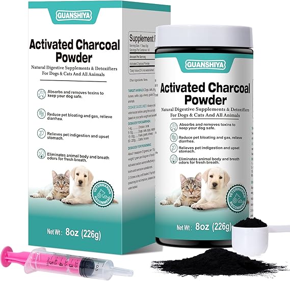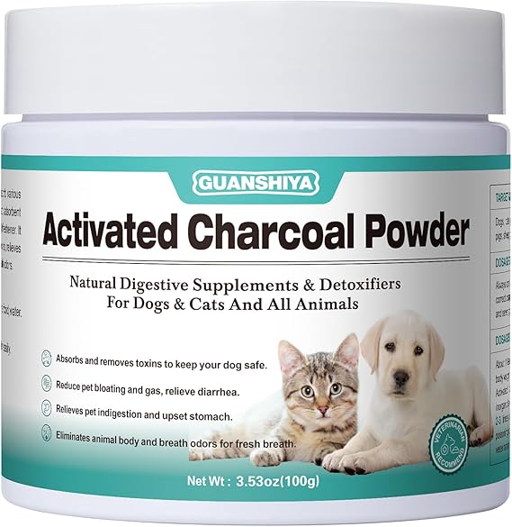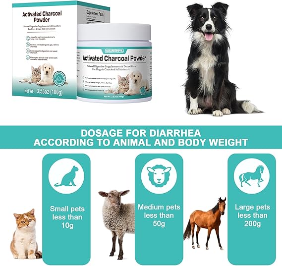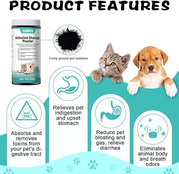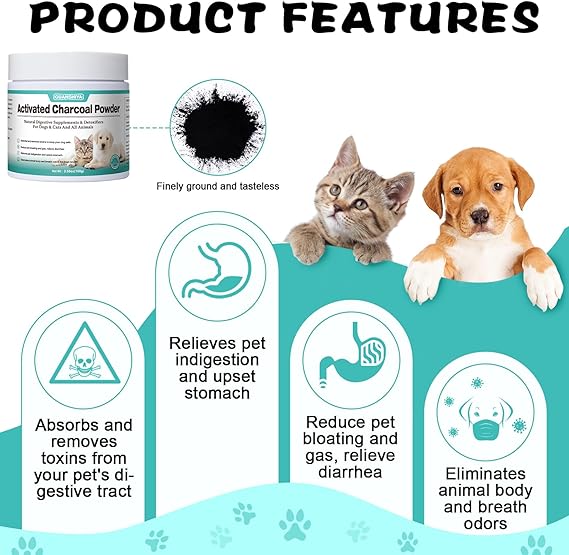 - Natural Digestive Aid - Activated carbon has an amazing ability to absorb various chemicals, the powder is delicate and odorless, easier to absorb and digest than charcoal pills, capsules, or tablets, active carbon absorbs chemicals or toxic substances like a super sponge, and passes them out through feces Toxins in the body. It can help animals reduce bloating and gas, and relieve diarrhea and indigestion problems