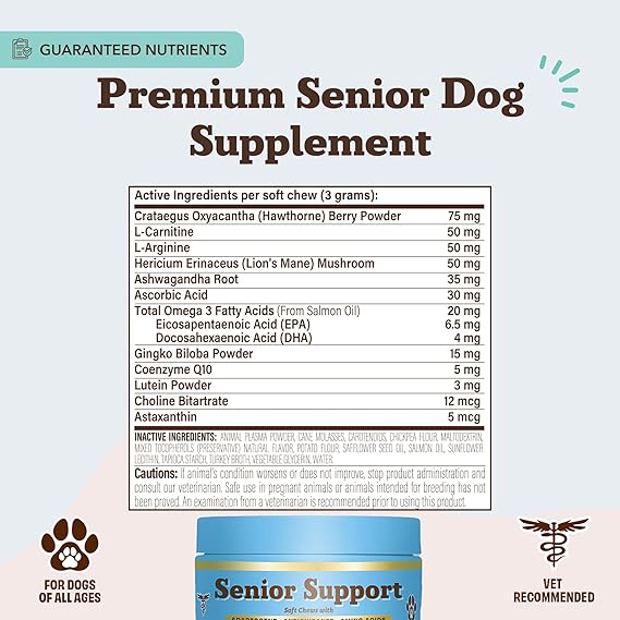 - SMARTER FORMULA WITH FUNCTIONAL INGREDIENTS: While most senior dog supplements stop at basics, our senior dog supplements go further with targeted ingredients. Lion’s Mane and Ginkgo help support memory and focus, Lutein promotes visual clarity, and CoQ10 and L-Carnitine aid heart function and energy metabolism, giving your dog support where it matters most.