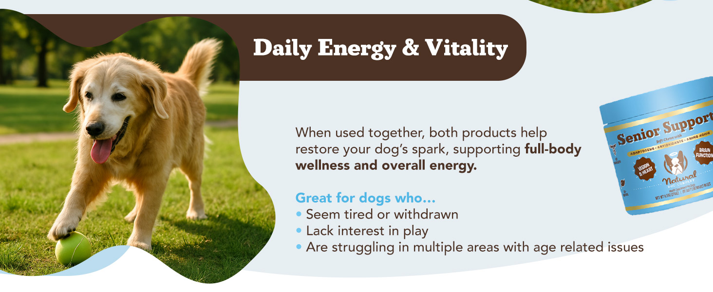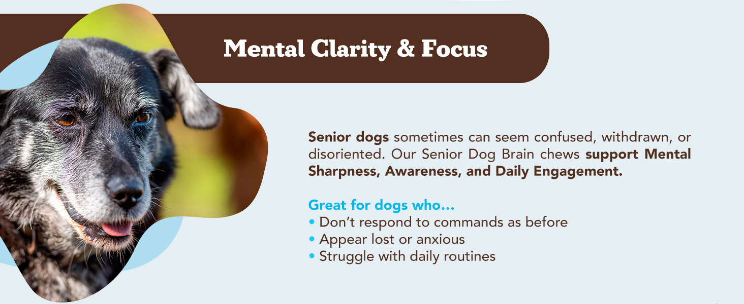 - SUPPORTS MEMORY, FOCUS & MENTAL CLARITY: As dogs age, changes in brain function can impact behavior and responsiveness. Our senior formula supports cognitive health with ingredients that help maintain alertness, focus, and overall brain wellness—so your best friend stays sharp, engaged, and connected to you.